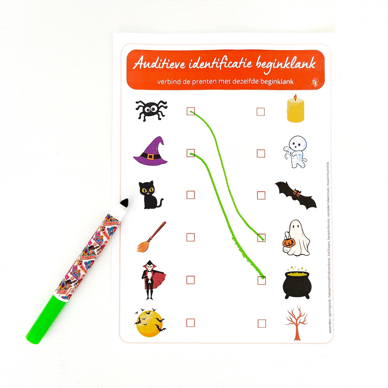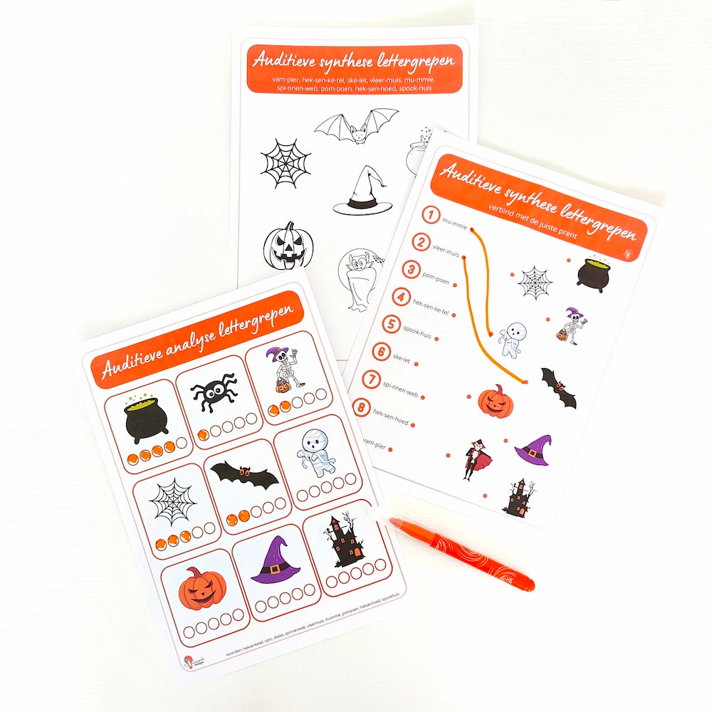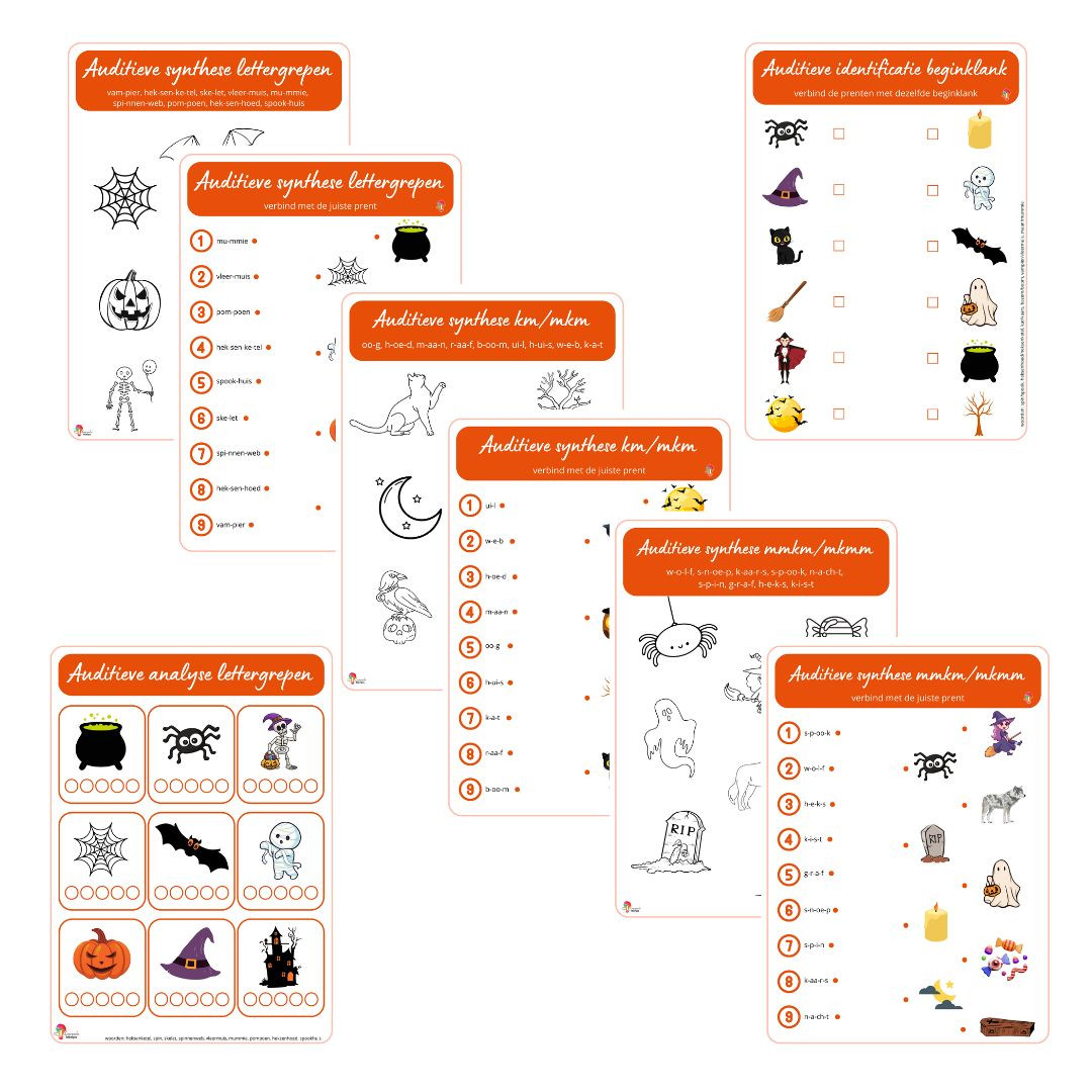 8 Gratis werkblaadjes om de auditieve vaardigheden verder in te oefenen met woorden van thema Halloween.