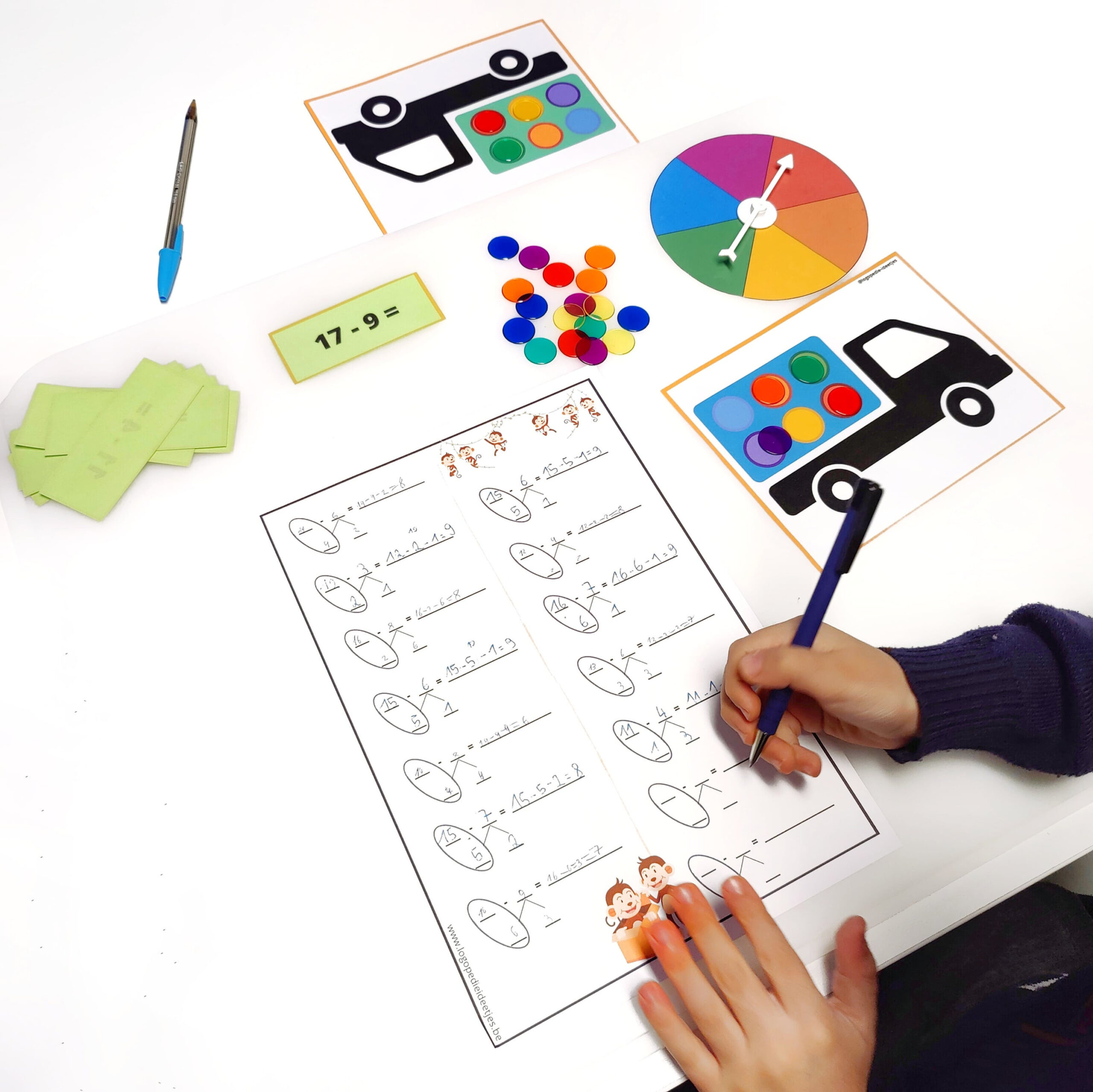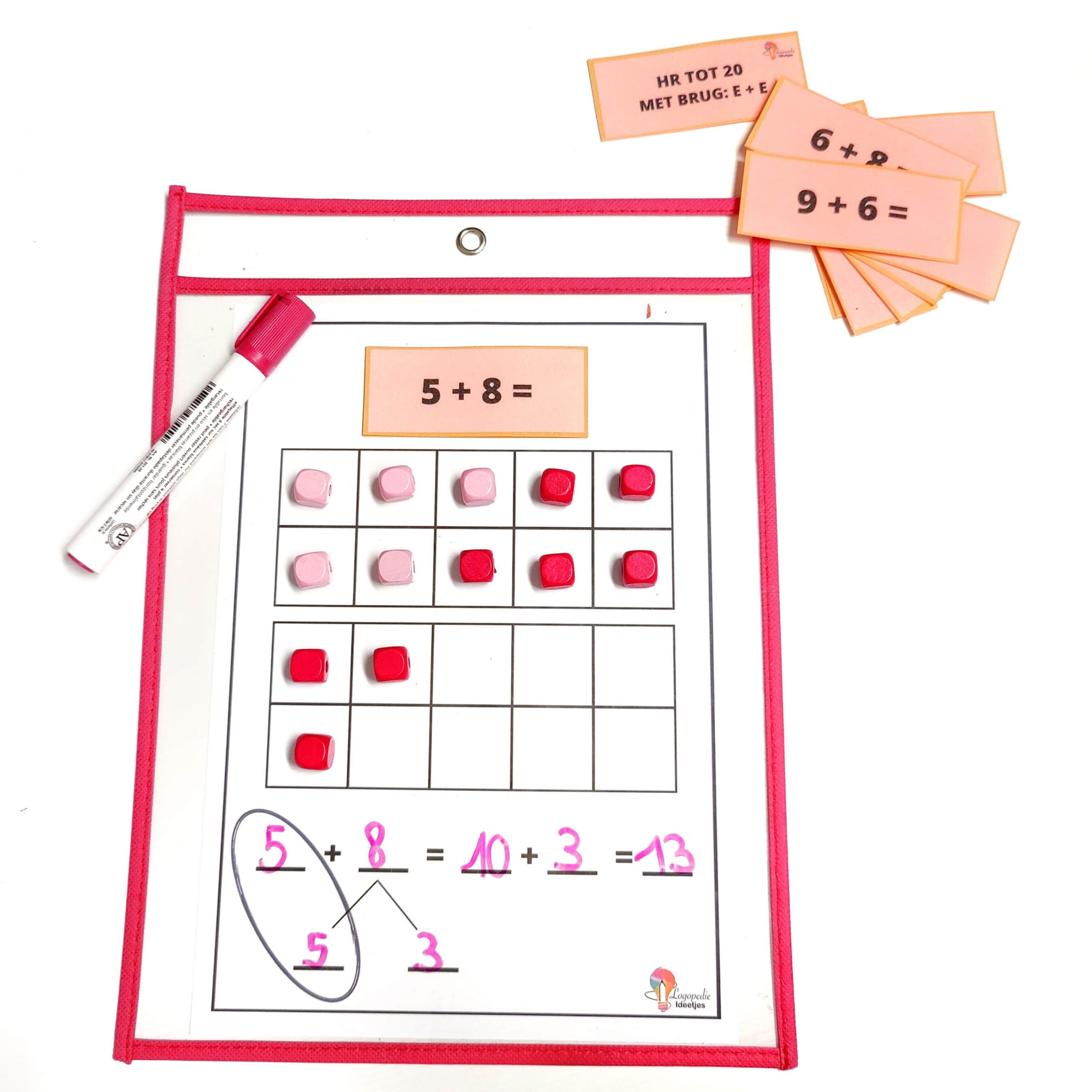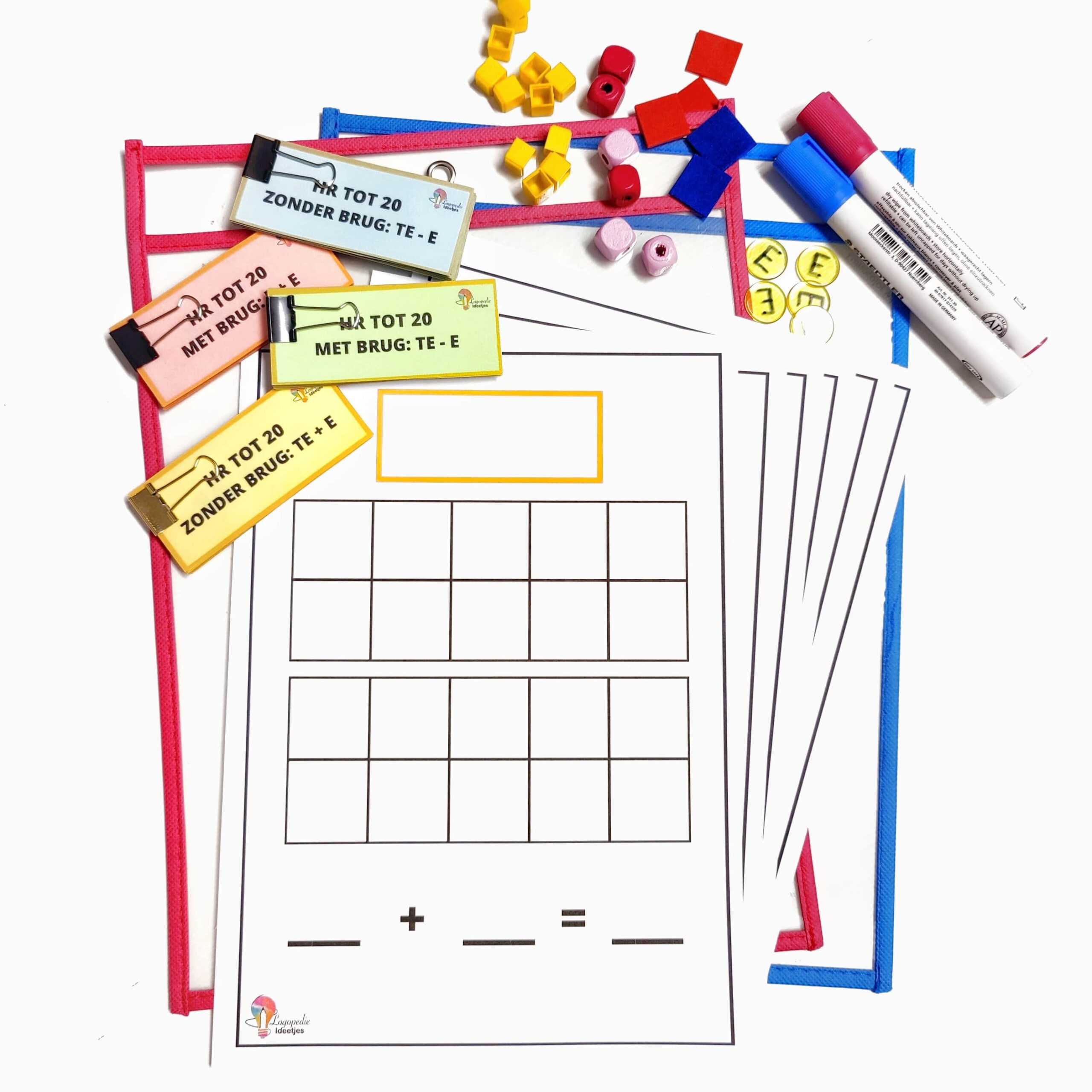 - 6 templates om het hoofdrekenen visueel te maken met concreet rekenmateriaal (plus, min, zonder brug, met brug)