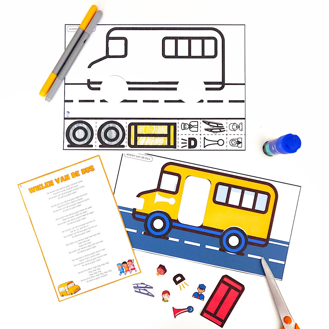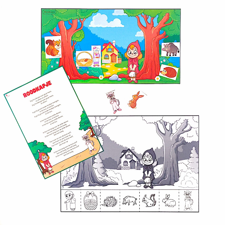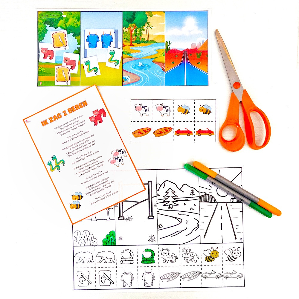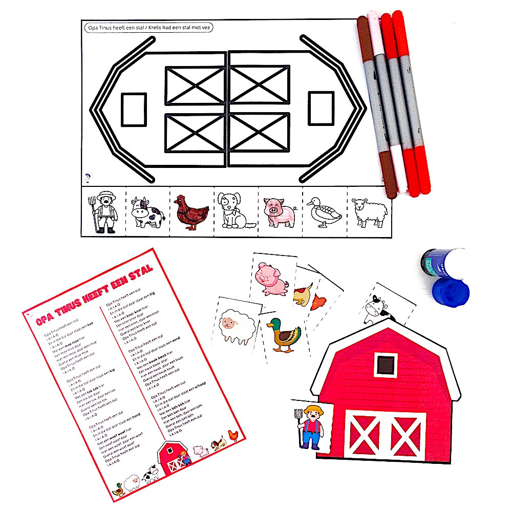 - Scènemateriaal: deze kunnen voor, tijdens of na het zingen gebruikt worden. Het is een leuke manier om met het liedje op andere manieren aan de slag te gaan. Bijvoorbeeld erover te babbelen, vragen te stellen, verder over na te denken of er een speelse situatie rond te creëren. Elke scène werd uitgewerkt in kleur en in zwart-wit. Bij de zwart-wit versie kan je het kind eerst laten kleuren om extra herhalingen uit te lokken. Naast het geprinte materiaal kan je dit ook koppelen aan concreet materiaal (bv. visjes, boerderij,…)