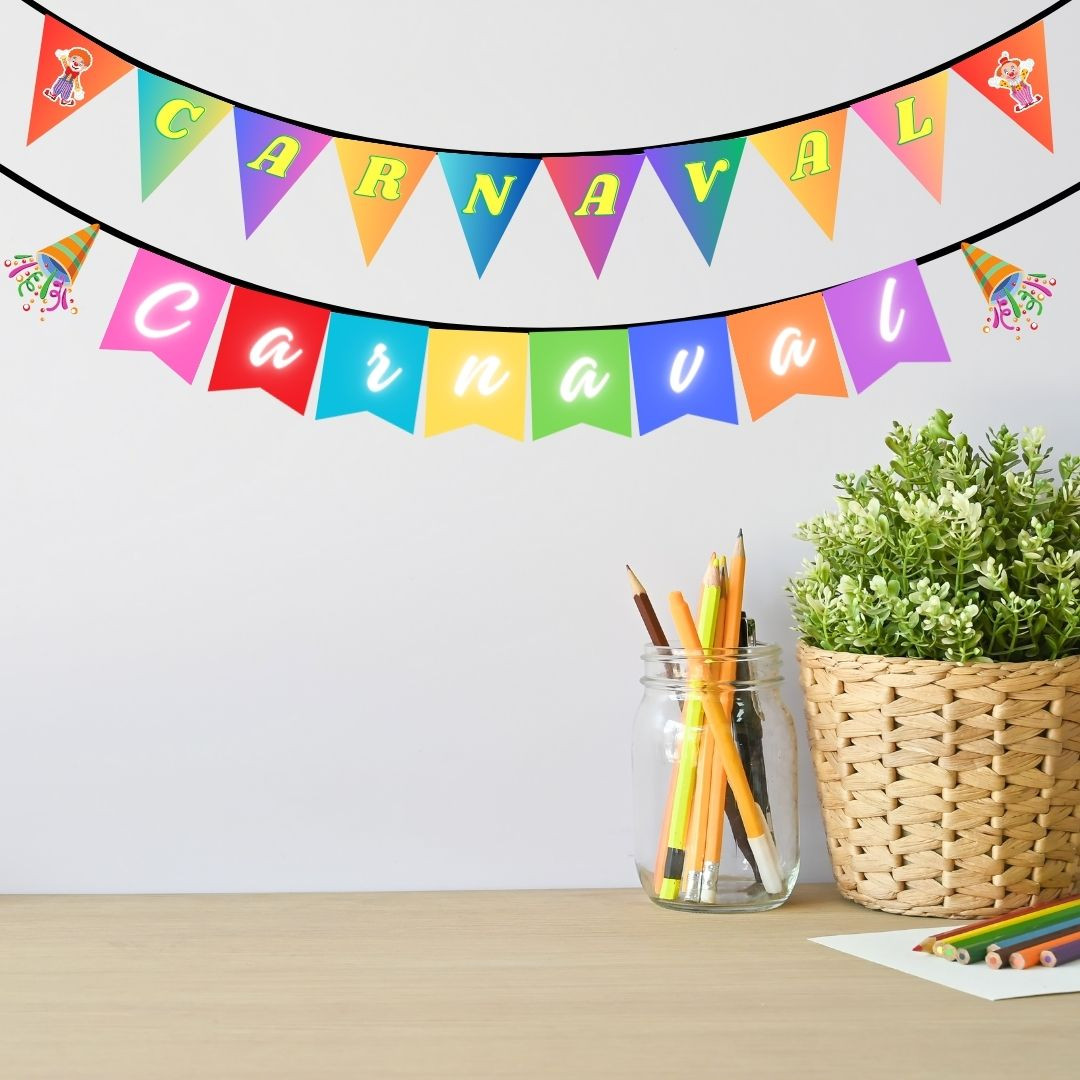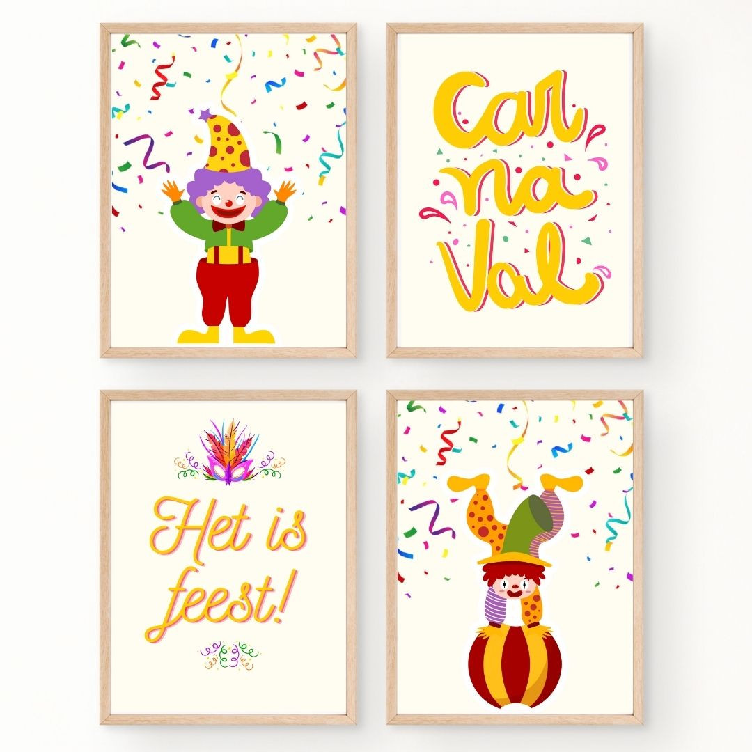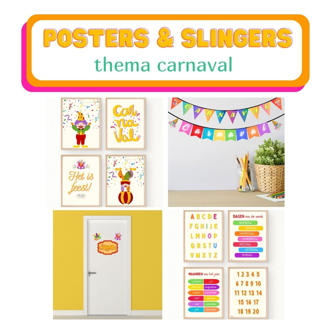 2 slingers, 1 deurdecoratie en 8 posters om je lokaal in een feestelijke carnavalssfeer te brengen.