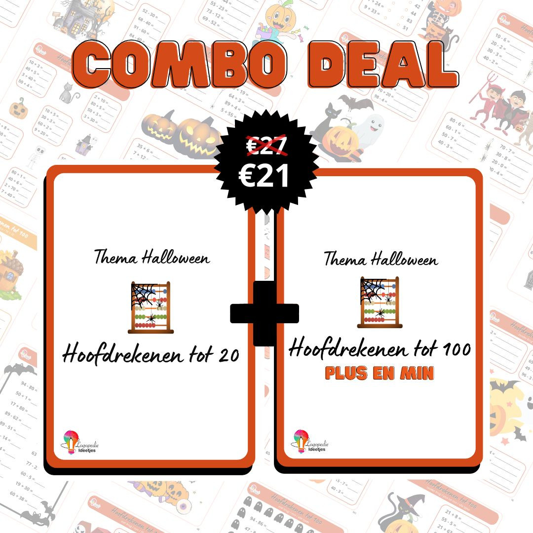 Ben je geïnteresseerd in zowel hoofdrekenen tot 20 als hoofdrekenen tot 100 van thema Halloween? Sla hier je slag met de combo deal: samen voor €21 in plaats van €27. Goed voor in totaal 196 pagina’s rekenplezier.