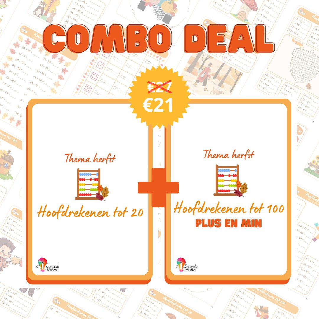 Ben je geïnteresseerd in zowel hoofdrekenen tot 20 als hoofdrekenen tot 100 van thema herfst? Sla hier je slag met de combo deal: samen voor €21 in plaats van €27. Goed voor in totaal 196 pagina’s rekenplezier.