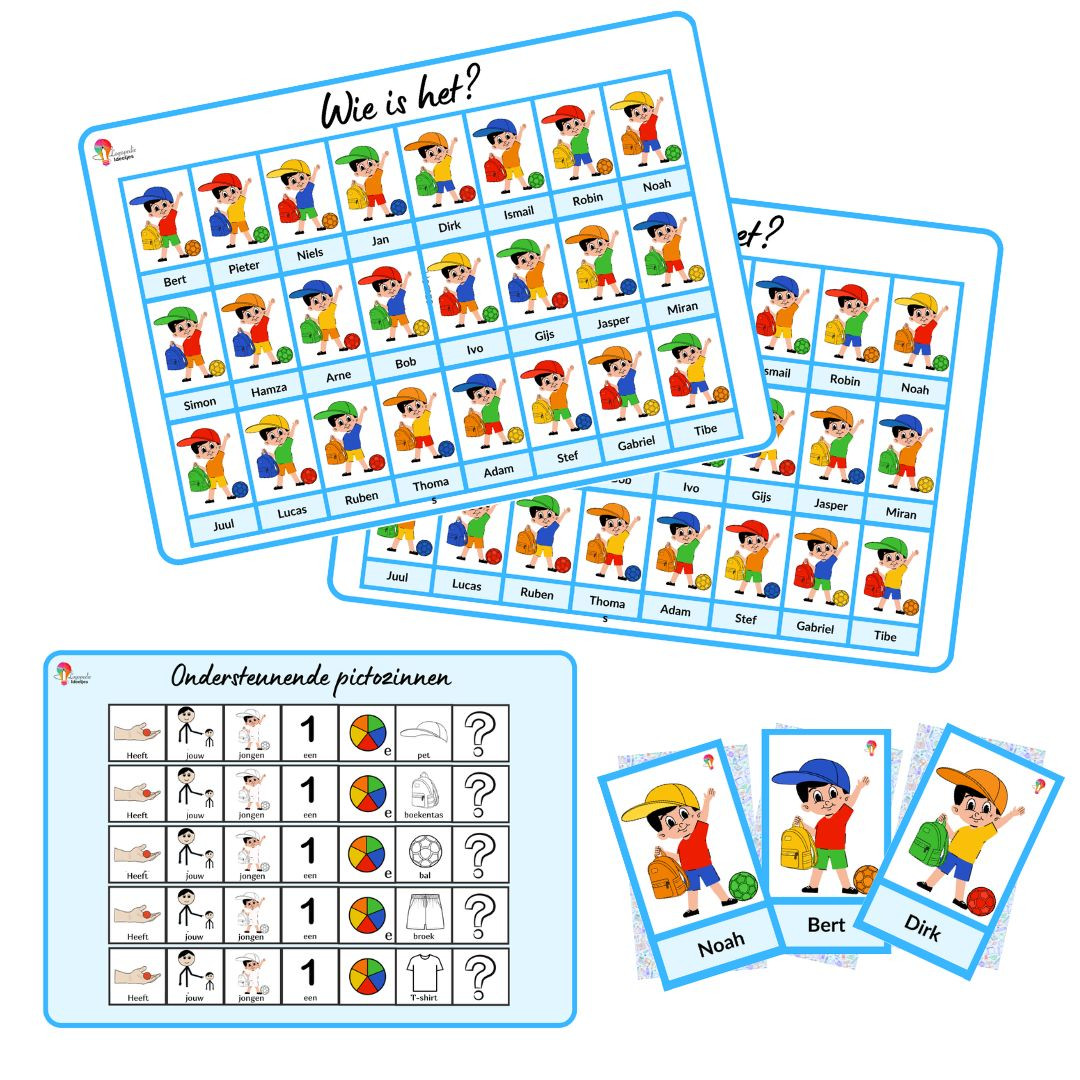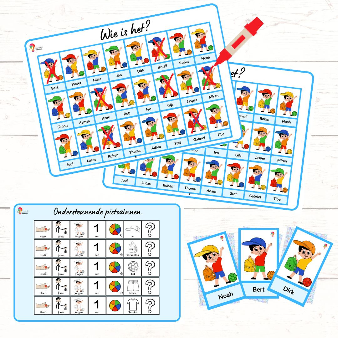 Dit leuke spel maakt leren van woordenschat, kleuren en zinsbouw een avontuur. Met 24 unieke schooljongens is er elke keer weer een nieuwe uitdaging. Kan jij slimme vragen stellen en als eerste achterhalen wie de geheime schooljongen is? Inclusief handige pictozinnen voor extra ondersteuning.