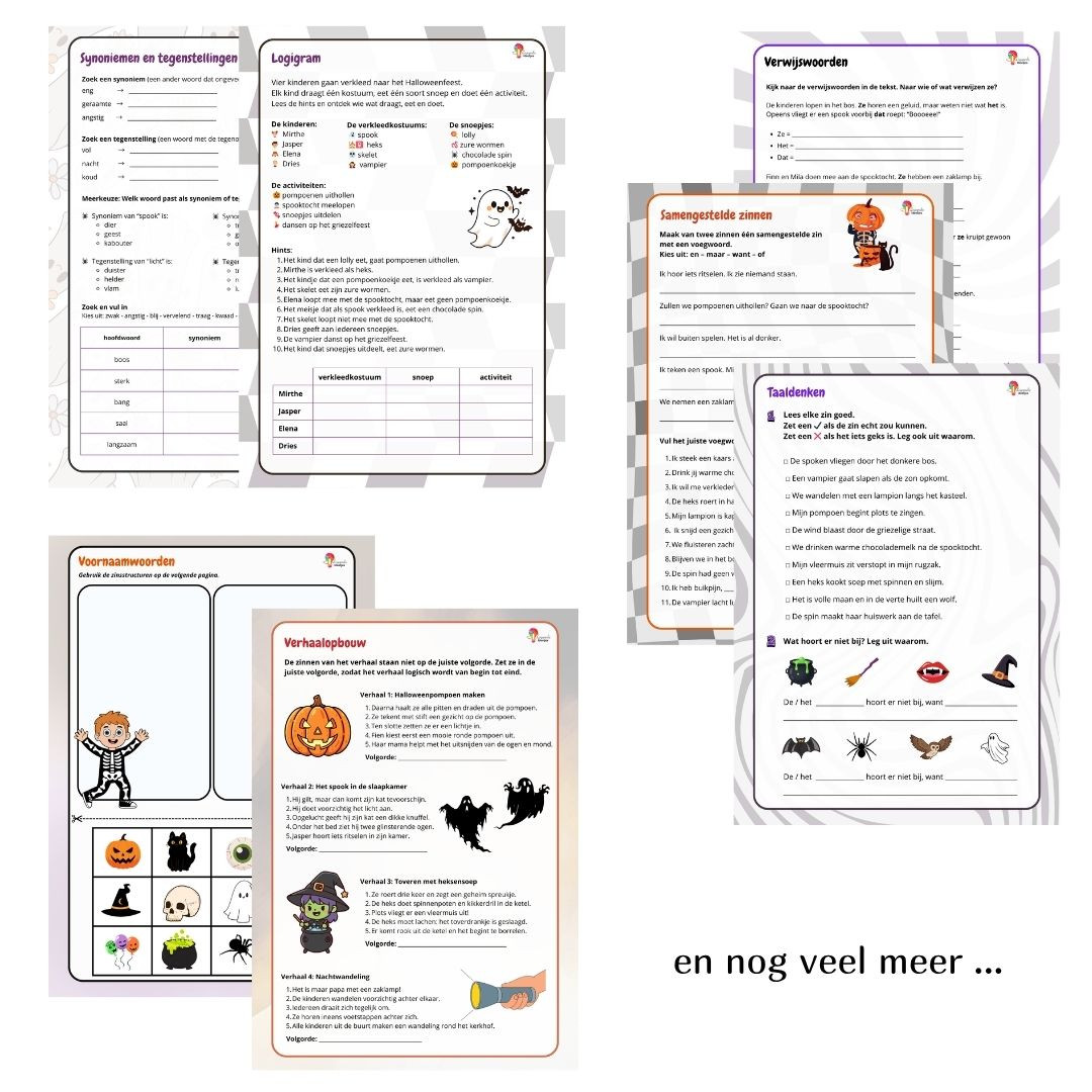 Deze uitgebreide taalbundel staat helemaal in het teken van Halloween en biedt een brede waaier aan verschillende taalactiviteiten. De bundel is speels opgebouwd en ondersteunt op een leuke manier verschillende taaldomeinen zoals morfologie, syntaxis, lexicon, semantiek en pragmatiek.