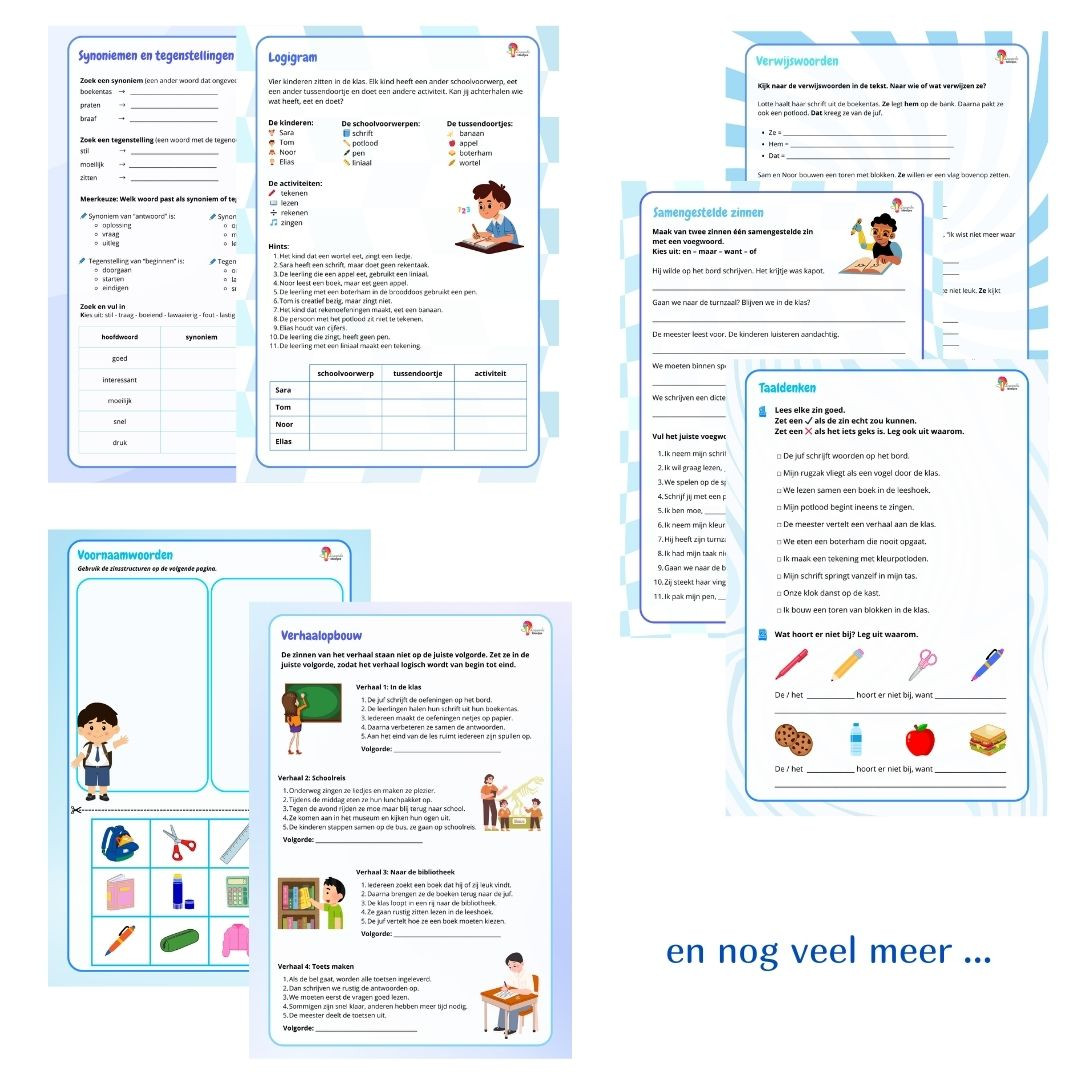 Deze uitgebreide taalbundel staat helemaal in het teken van school en biedt een brede waaier aan verschillende taalactiviteiten. De bundel is speels opgebouwd en ondersteunt op een leuke manier verschillende taaldomeinen zoals morfologie, syntaxis, lexicon, semantiek en pragmatiek.