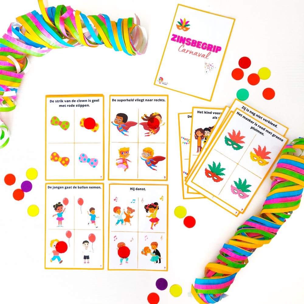 11 kaartjes voor het oefenen op het schriftelijk of auditief zinsbegrip in thema carnaval.