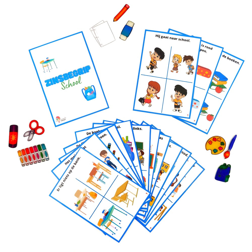 15 kaartjes voor het oefenen van taal met het schriftelijk of auditief zinsbegrip, passend binnen thema school.