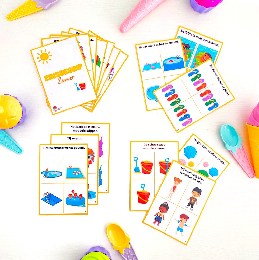 15 kaartjes voor het oefenen op het schriftelijk of auditief zinsbegrip, passend binnen thema zomer.